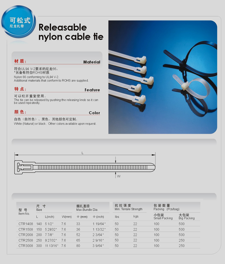 產(chǎn)品名稱:尼龍?jiān)鷰В櫭家鉃槔υ鷸|西的帶子,設(shè)計(jì)有止退功能(活扣式除外),只能越扎越緊,也有可拆卸的扎線帶(活扣)。